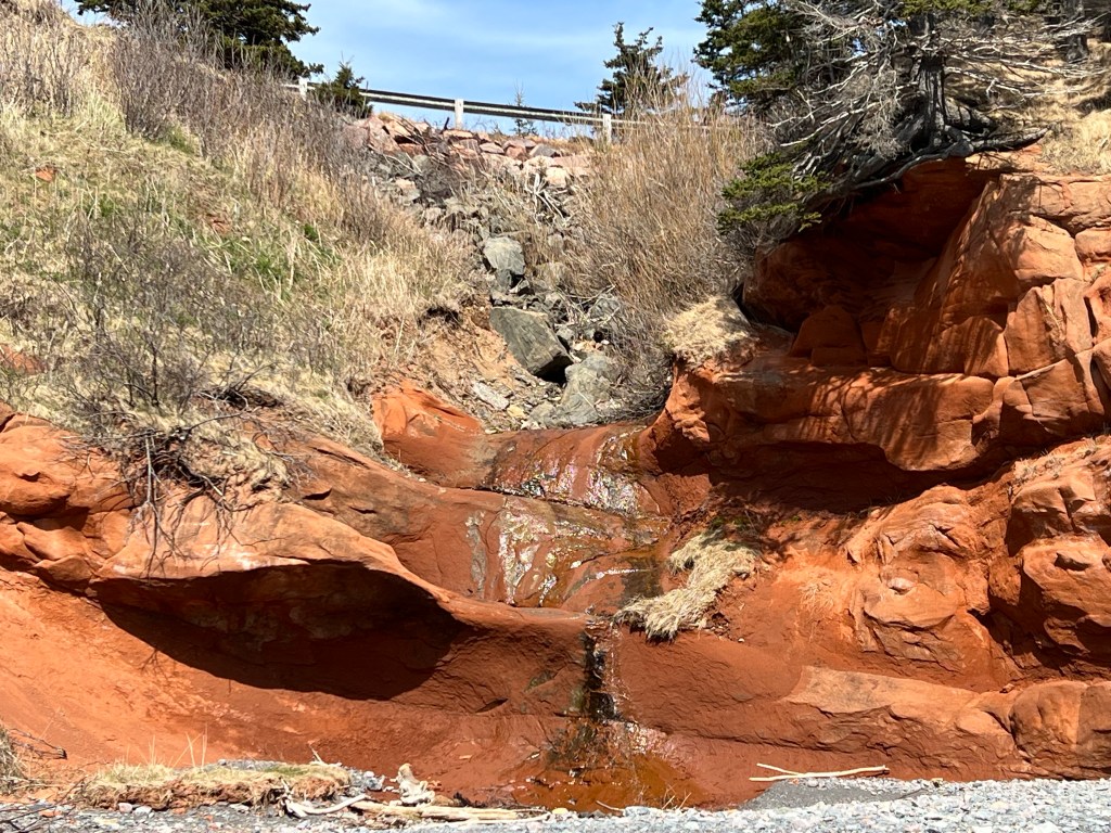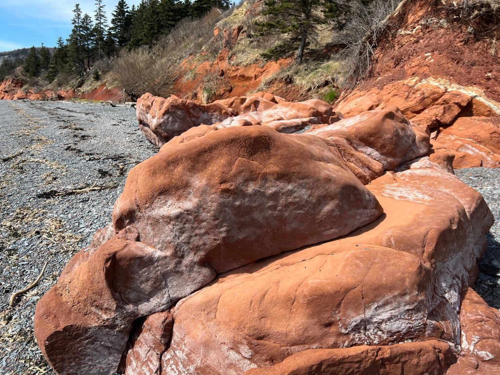 On a grey and drizzly day the Red Rocks along West Advocate Beach always add a splash of much needed colour. On the way toward McGahey Brook, our turn around point yesterday, the sandstone formations appeared to be of a soft pink. On the way back the light had changed slightly due to the angle of the sun behind the clouds. It was enough to give us an intense orange colour, one not to be overlooked!