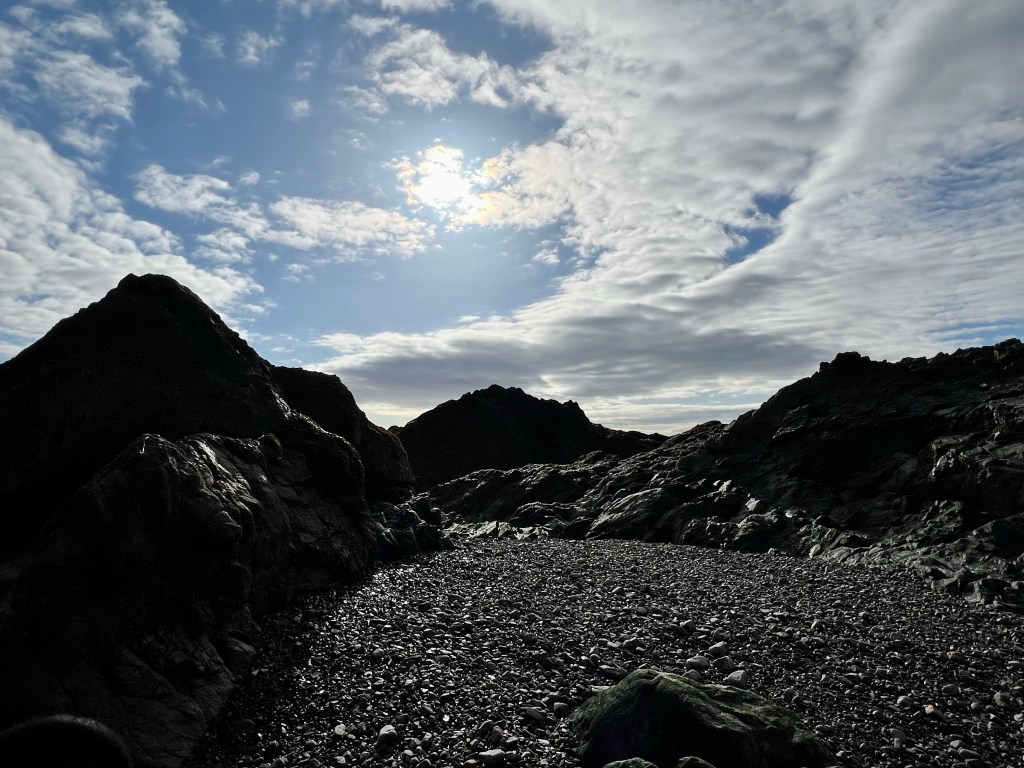 “Mermaid’s Cave” was barely recognizable! The relentless tides and wind had completely transformed the formerly sandy beach into a field of rubble. Large pebbles were piled up high and we had to climb up into the cave to explore.