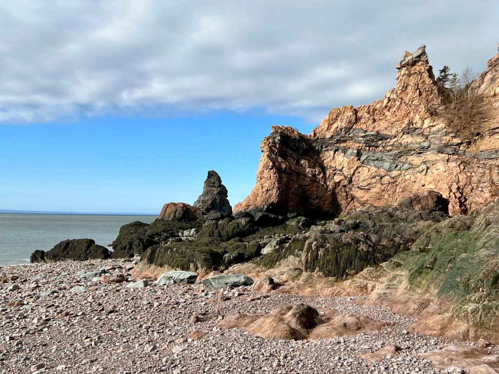 Spencer’s Island Beach is a personal favourite. It’s magical in any weather and season. We set out about 2 hours after high tide and had no delays. This beach can be challenging to navigate if you have knee or ankle weakness. Trekking poles are a great way to make the terrain easier to navigate.