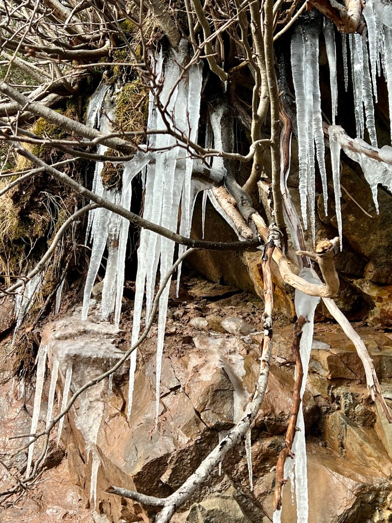 I carried a pack with first aid kit, warming blanket and micro spikes just in case. My pack also contained a water bladder with 1.5 litres of water, some group snacks to share and a light lunch. I always carry an extra sweater, fire starter supplies, a charger for my phone, extra mittens, socks and toque. I highly encourage the use of adjustable hiking poles for balance and when navigating steep and rocky downhill approaches.