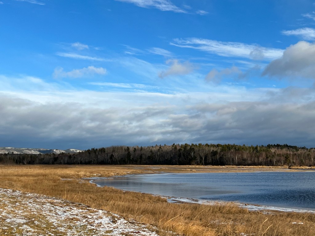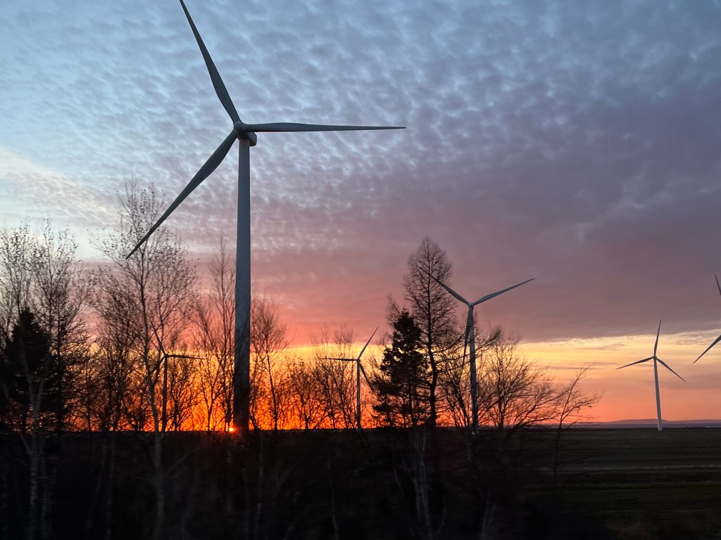 One of the marvellous things when travelling to and from New Brunswick is the marsh landscape. Numerous wind turbines contrast with trees providing strong silhouettes at sunset. Tonight the sky was dappled with mauve clouds while the sun slowly slipped below the horizon providing one more fiery splash.