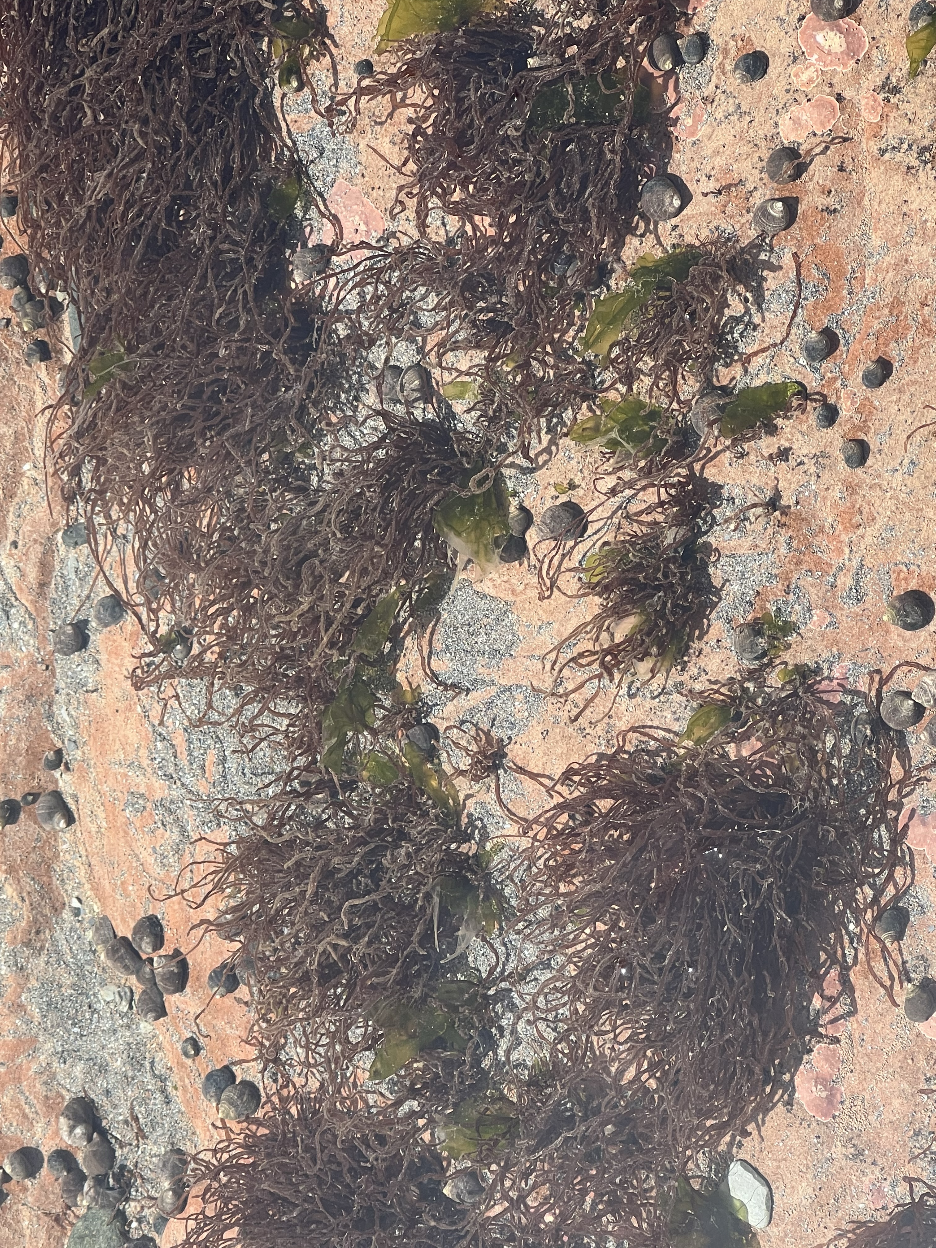 The first time I set foot on this stretch of beach the rock formations were shrouded in fog. In the brilliant sunshine everything looks different again. It was 28C and we dove in and out of the shade while sipping water to stay hydrated. we made it all the way to the mouth of the Ramshead River where we longingly looked at the algae covered rocks on the adjacent beach.