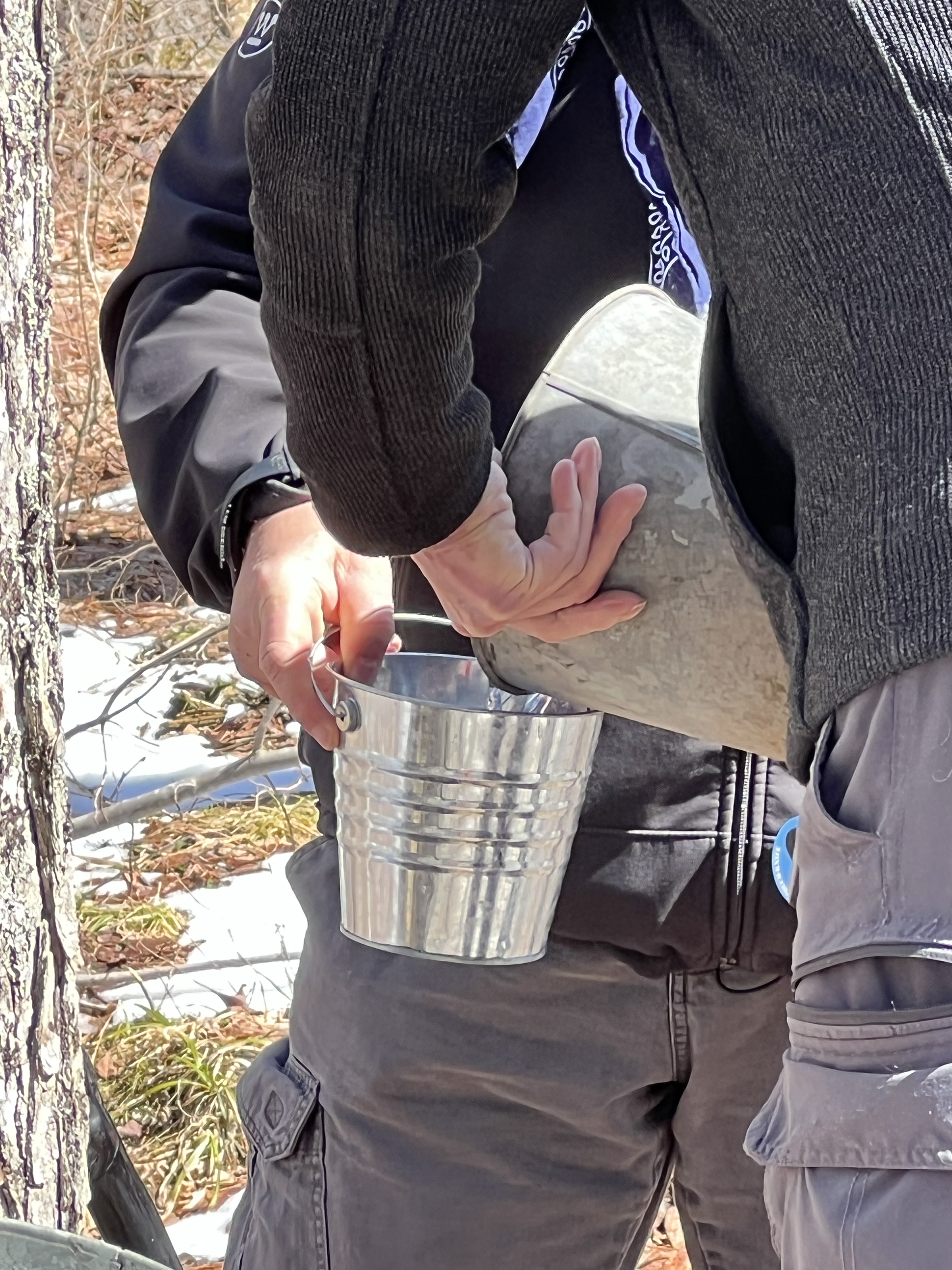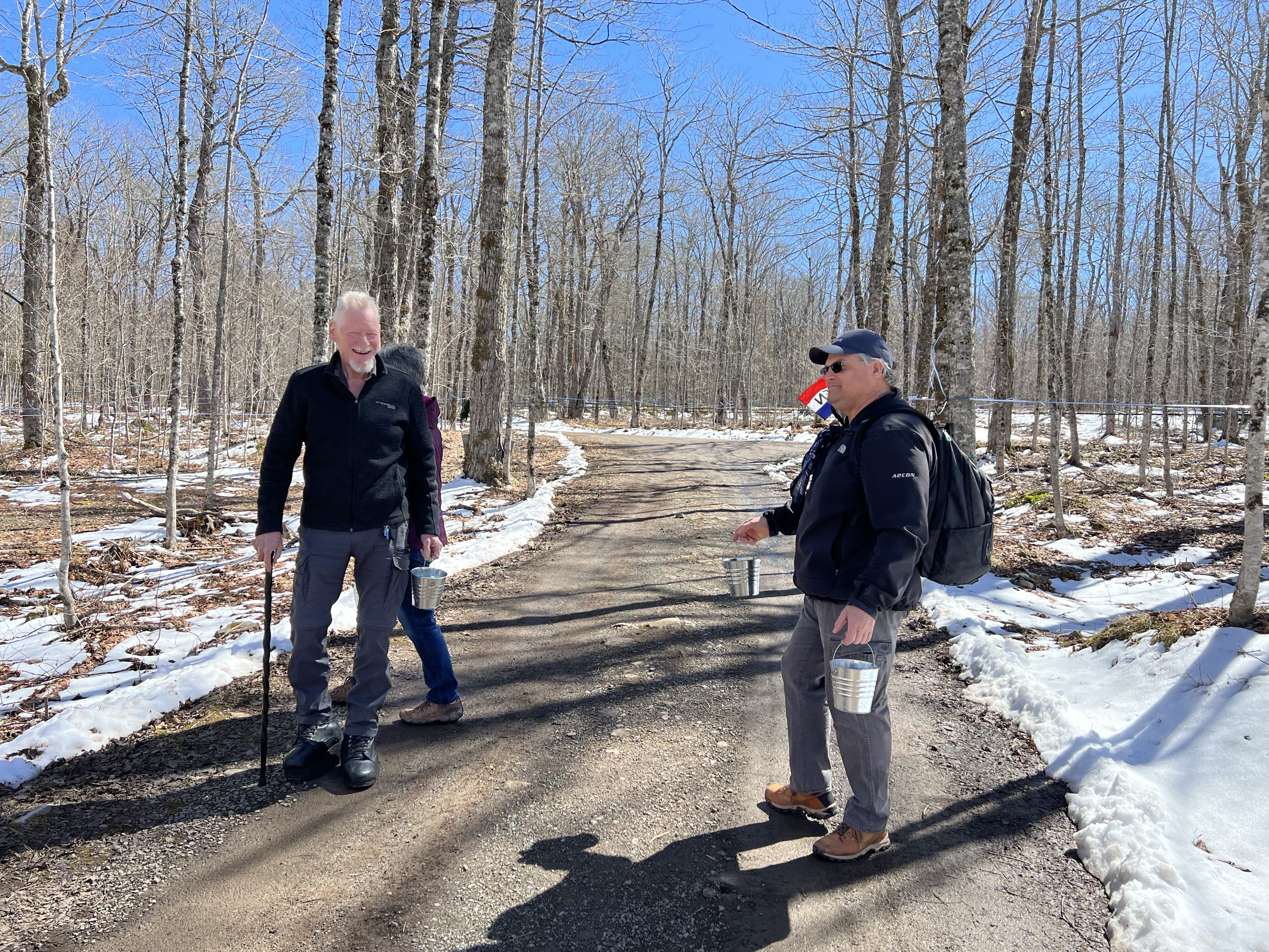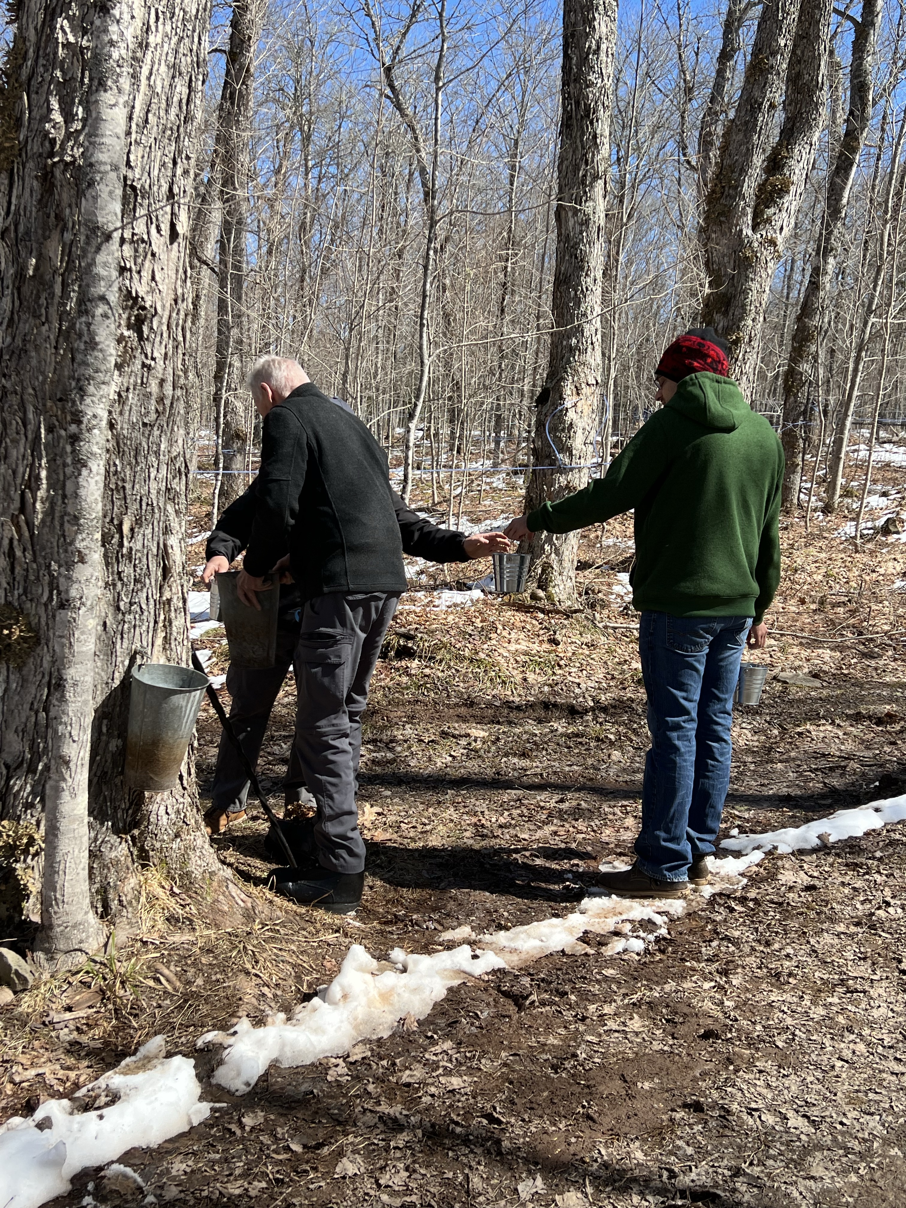 Our friends were curious about the Fenwick Sugar Bush and since it was a fabulous spring day yesterday we went for an outing to Thompson’s and Ripley’s. It wasn’t busy at all, so we took part in collecting some sap which was rewarded with flakes of maple cream made that morning. What a treat!!