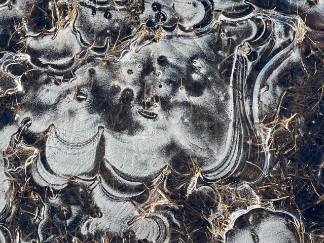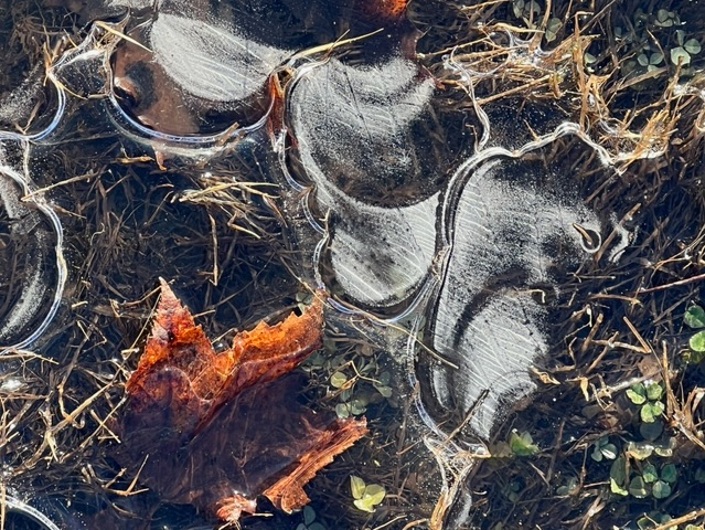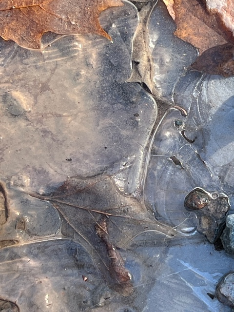 No, I didn’t drop anything! I was fully immersed in “filling the frame” with ordinary magic: There were leaves frozen into the ice, patterns resembling clouds and amazing lines I would never dream of putting on paper with a pen.