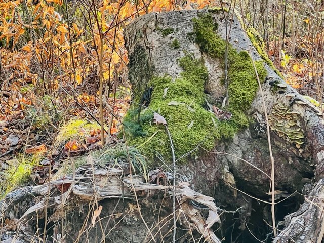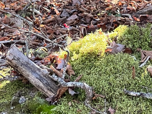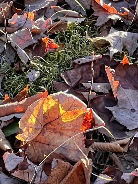 …as discovered during yesterday’s short stop at the Sugar Bush in Fenwick. The trees were devoid of leaves in sharp contrast to my last walk through this magical maple forest. But, as long as the sun shines there are wonderful discoveries to be made even during the latter part of November. I encourage you to click on each of the small images in the picture gallery above and observe and discover for yourself how the edges of dried up leaves can reflect their outline, and how a single spot of red shines like a beacon in the monochromatic mess of dried leaves covering the ground provides a spot for the eye to focus.